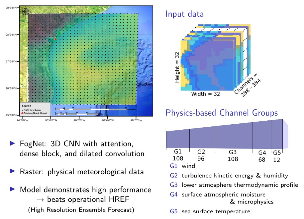 Coastal fog is a safety concern for transportation, particularly in a coastal city with frequent ship and plane travel. CBI AI2ES team has developed a sophisticated deep learning model, known as FogNet, which combines satellite sea surface temperatures and numerical model outputs to predict the onset of fog with 9 to 24 hours advance warning.