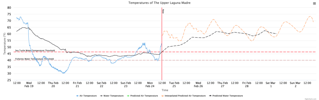 In collaboration with The Weather Company, students and faculty at Texas A&M — Corpus Christi have developed an AI operational prediction model (shallow neural net) to predict water temperatures in the Laguna Madre. This provides up to 120 hours lead time facilitating the decision process ahead of cold-stunning events.