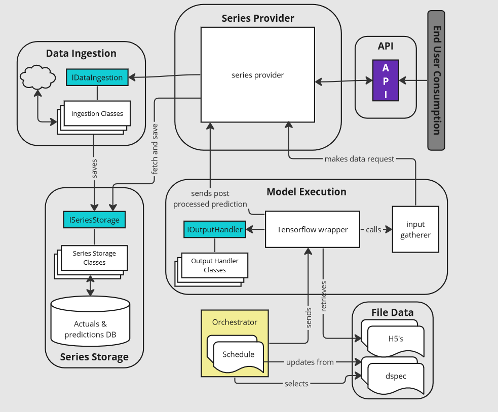 Semaphore is a python program that semi-automates the operationalizing AI models, at present models that can be saved as .H5 files. Semaphore uses an agile design, specific data objects, an easily expandable data ingestion module, and a database to support a wide variety of data series.
