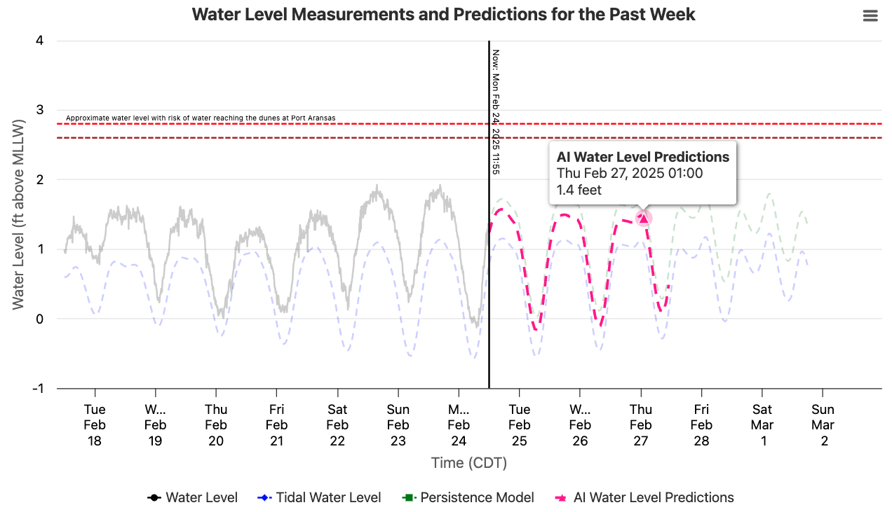 A team of undergraduate students developed water level predictions visualizations for stakeholders and scientists (see right). These predictions are not only provided to stakeholders, such as the Nueces County Coastal Parks, but also available to the public online through Texas A&M – Corpus Chrisiti.