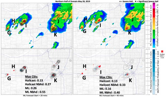 In a collaboration with government researchers at NOAA’s National Severe Storms Laboratory and private industry researchers at Vaisala, AI2ES created an AI approach to nowcasting hail and convective initiation. The prototype hail prediction model developed here at the institute was further improved by an AI2ES student through an internship at Vaisala. This work provided a better understanding the role of lightning during storm lifecycles and the likelihood of hail using the the hail prediction model. These models are currently being operationalized and refined into a product at Vaisala.