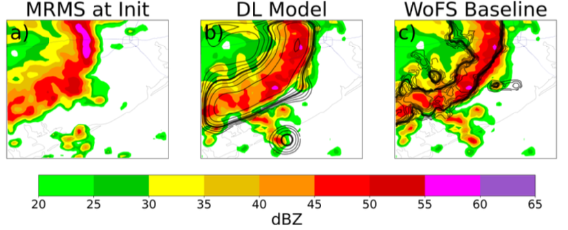 Our institute has been deeply embedded in improving the understanding and prediction of convective initiation and hazards while advancing XAI and deep learning methods for Earth system sciences. We developed a U-Net deep learning model to predict locations of thunderstorms trained on Warn-On-Forecast System (WoFS) model data consisting of environmental data. This model outperformed WoFS convection with a 30-minute lead time, providing insights into potential future improvements to WoFS. This work was done in collaboration with the National Severe Storms Laboratory (NSSL).