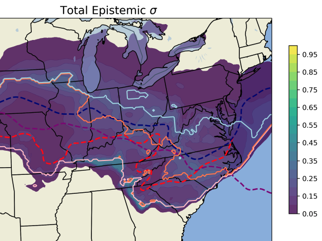 In addition, our researchers have developed methods of quantifying uncertainty in Earth System Sciences. Our collaborators at NSF NCAR developed a new python package, MILES GUESS, which provides Keras and Pytorch implementations of evidential deep learning models and supports analysis of aleatoric and epistemic uncertainties. This package enables both categorical and regression task evidential learning.