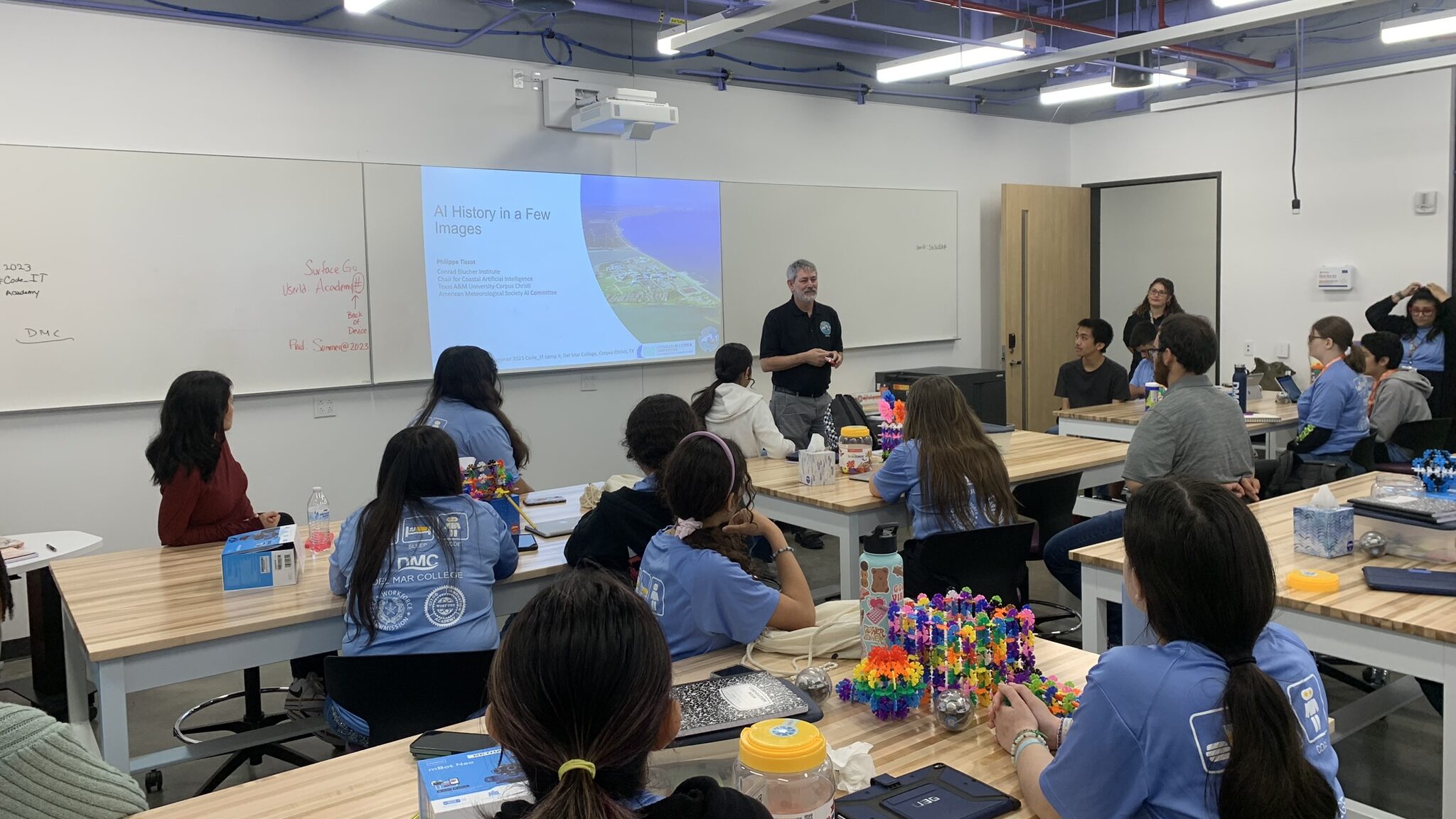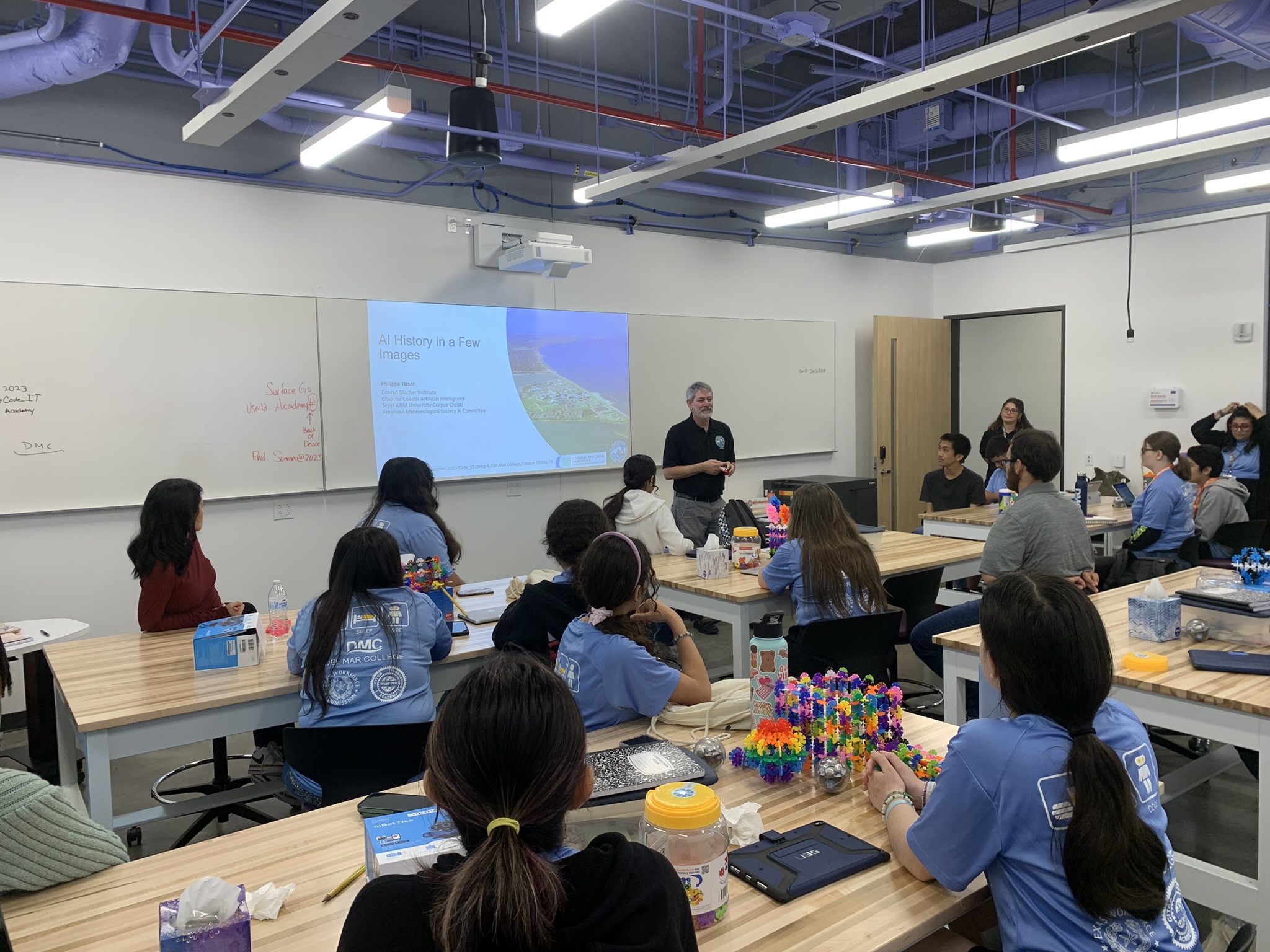 We hold an annual, two week Summer Code Camp, #Code_IT Camp at Del Mar Community College. Every year we host 30+ middle school students from the greater Corpus Christi, Texas area to engage with coding and STEM topics. The camp offers several levels of coding curriculum focused on spatial reasoning and computer programming, logic-based programming, and text-based coding for drones. AI2ES researchers and graduate students give technical presentations on their research and hold panel informational sessions, bringing a greater awareness of science careers to the campers.